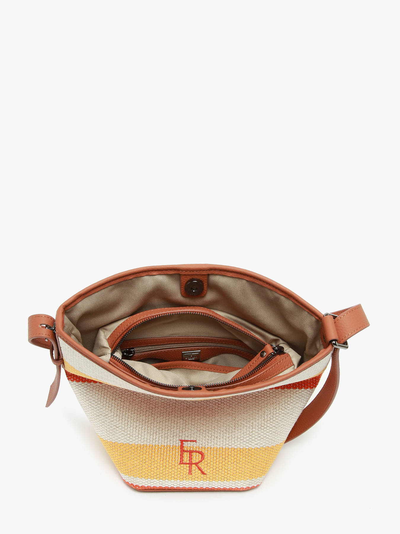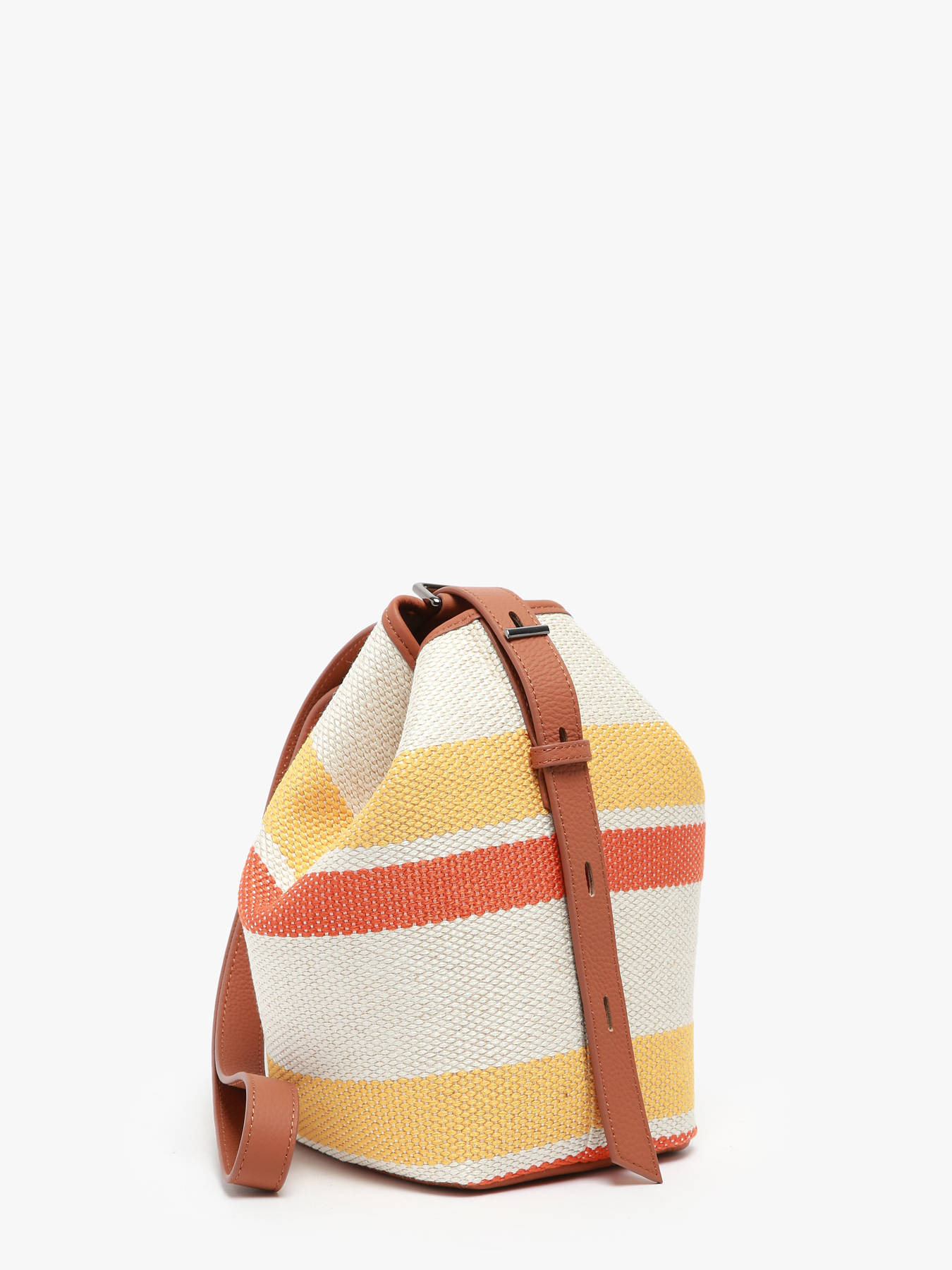 This ETRIER crossbody bag from the CAVALIER TOILE line, made of cotton with leather trim, offers great versatility. It features a snap and magnetic closure and can be worn as a crossbody or backpack thanks to its bucket-style design. Simply reposition the inner pouch and adjust the strap to switch to backpack mode. The embossed ETR logo adds a refined touch. Available in trendy colorful canvas for summer or a solid linen-inspired version.