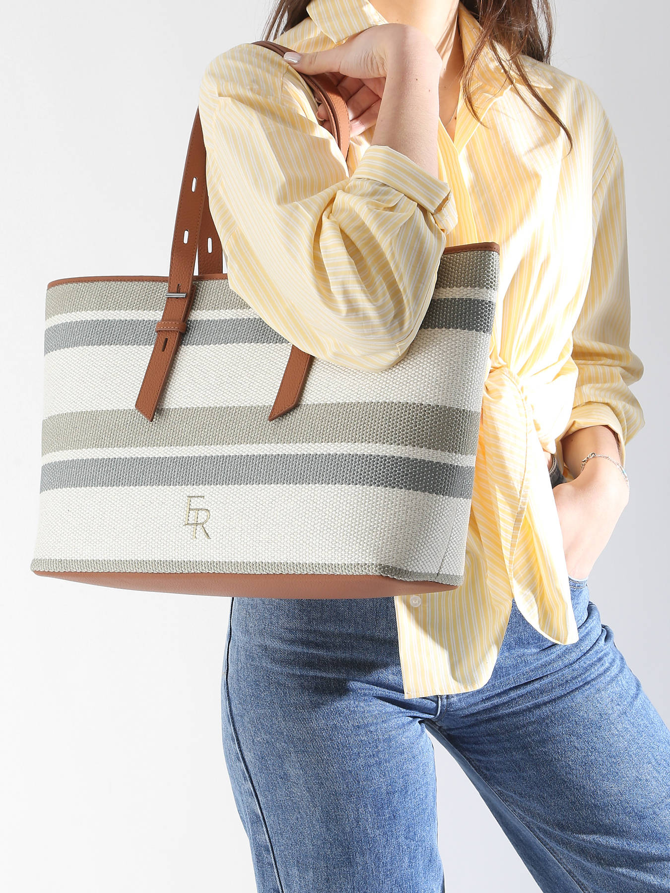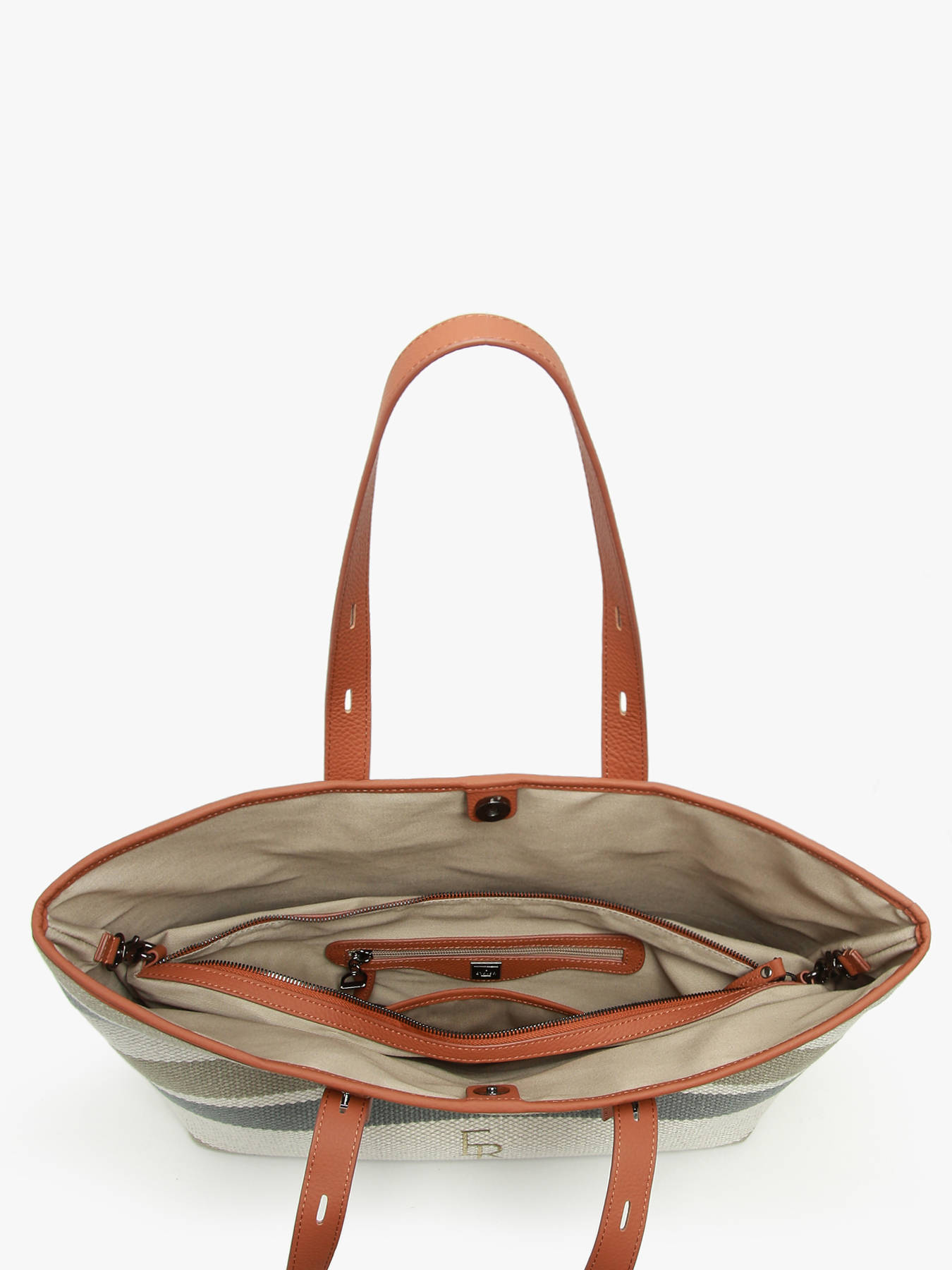 This ETRIER shoulder bag from the CAVALIER TOILE line, made of cotton with leather trim, is a practical and elegant tote. Magnetic snap closure. With a 23 cm handle, it features a functional interior with pockets and compartments. Embossed ETR logo adds a refined touch. Available in trendy colorful canvas for summer or a solid linen-inspired version.
